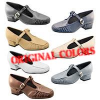 Nappa leather pucker moc T-strap with 1 1/4" covered heel.