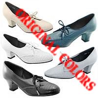 Perforated nappa leather oxford with 1 3/4" wrapped heel, steet sole.