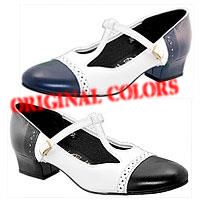 Two-tone nappa leather spectator toe T-strap with 1 1/4" covered heel.