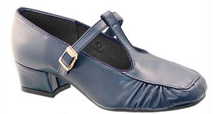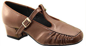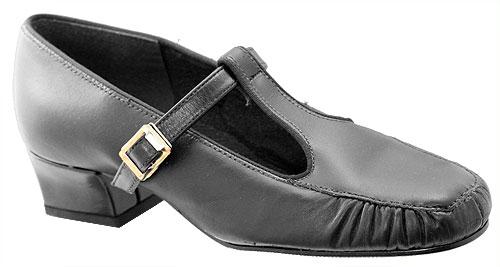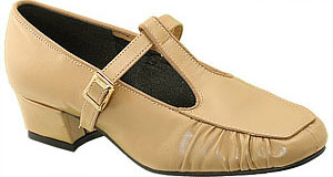 Nappa leather pucker moc T-strap with 1 1/4" covered heel.