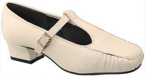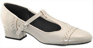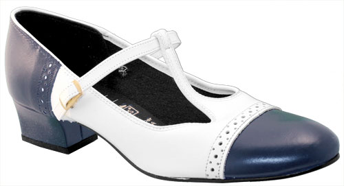 Two-tone nappa leather spectator toe T-strap with 1 1/4" covered heel.