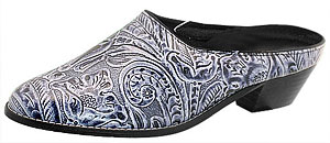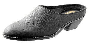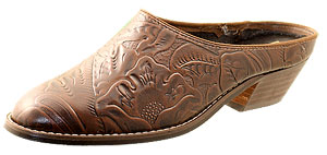 Tooled leather western mule with manmade western sole, 1 3/8" heel.