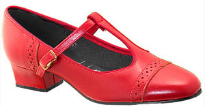 Solid-tone nappa leather spectator toe T-strap with 1 1/4" covered heel.